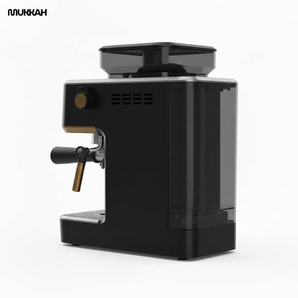 The Mukkah All-In-One Espresso Machine is a professional-grade home coffee station designed for enthusiasts who demand café-quality results with a modern aesthetic. It features a high-resolution touchscreen interface, a built-in precision conical burr grinder, and a commercial 58mm portafilter. This model is characterized by its sleek black finish and premium gold-toned accents, blending industrial performance with luxury kitchen design.