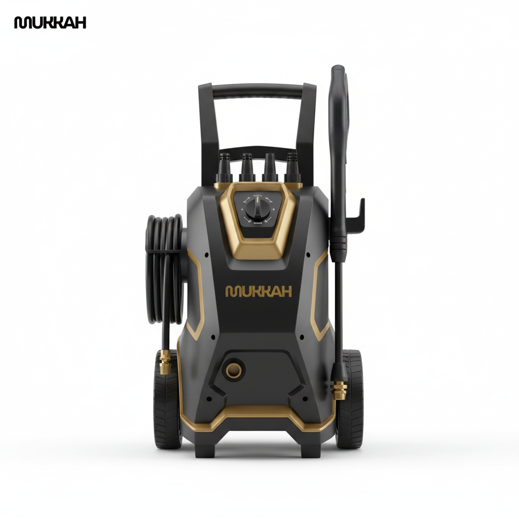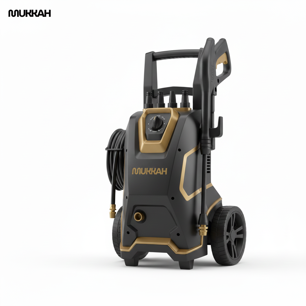 The Mukkah Electric Pressure Washer is a high-performance cleaning solution designed for heavy-duty residential use. Featuring a striking matte black and gold industrial aesthetic, it combines a powerful 1800W motor with a portable, wheeled chassis. This unit is engineered to bridge the gap between light-duty car washing and heavy-duty surface restoration for homeowners.