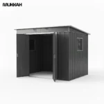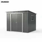 This shed is constructed from heavy-duty galvanized steel panels that are treated with a multi-layer coating to prevent rust, corrosion, and UV degradation. The vertical ribbing provides structural integrity against wind and snow loads. A key highlight is the sloped (pent) roof, which is specifically engineered to ensure rapid water runoff, preventing pooling and leaks. The interior is accessed via double sliding doors that operate on smooth tracks, saving valuable exterior space. The inclusion of a polycarbonate side window and two front air vents creates a bright, dry, and odor-free environment for your stored items.