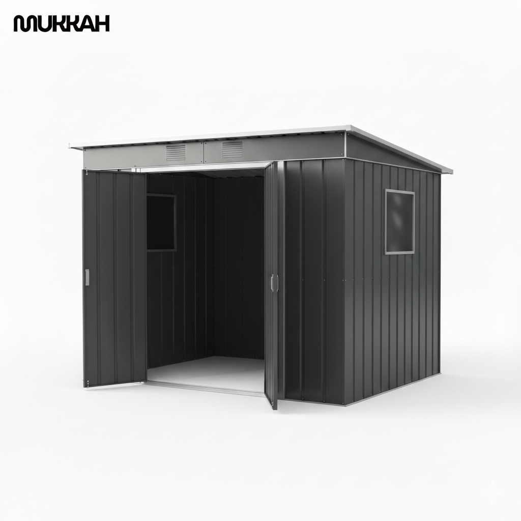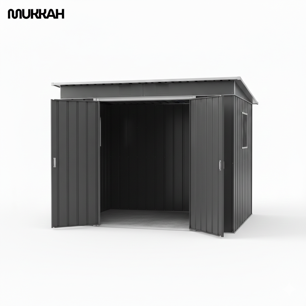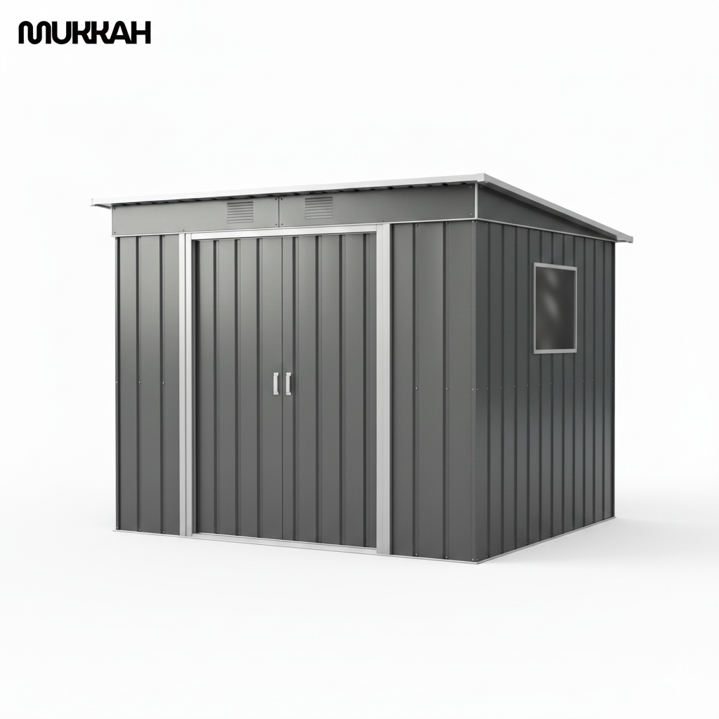 The Mukkah Metal Garden Shed is a durable, low-maintenance outdoor storage solution designed to withstand the elements while providing a sleek, modern aesthetic for backyards. It features a space-saving pent-roof design and integrated ventilation, making it ideal for storing high-value lawn equipment, bicycles, and garden tools. Its unique translucent side window distinguishes it from standard metal sheds by allowing natural light into the interior.